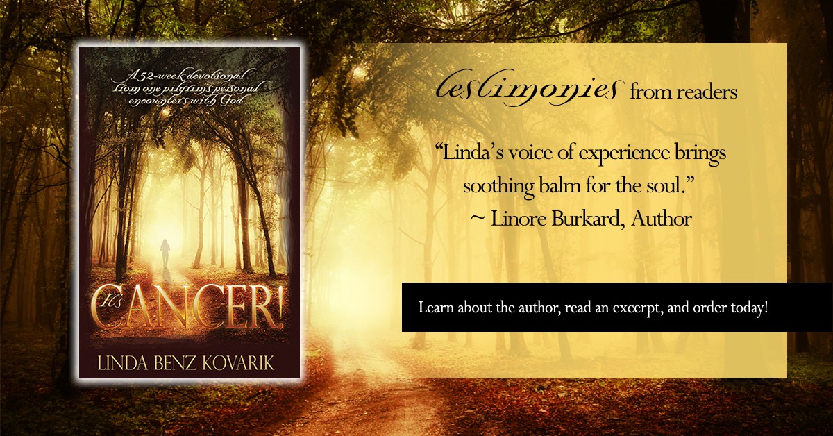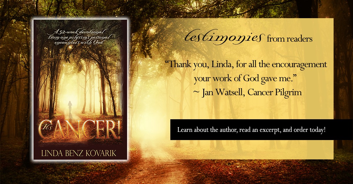 Through these encounters, God planted a seed in Linda’s heart to share His message of love, hope, and comfort with other pilgrims of cancer. First written and produced as cards of hope and encouragement, 52 of her most insightful and personal messages are compiled into It’s Cancer is a Christian Devotional Book for Cancer Patients – A 52 weekly devotionals from one pilgrims personal encounters with God.
